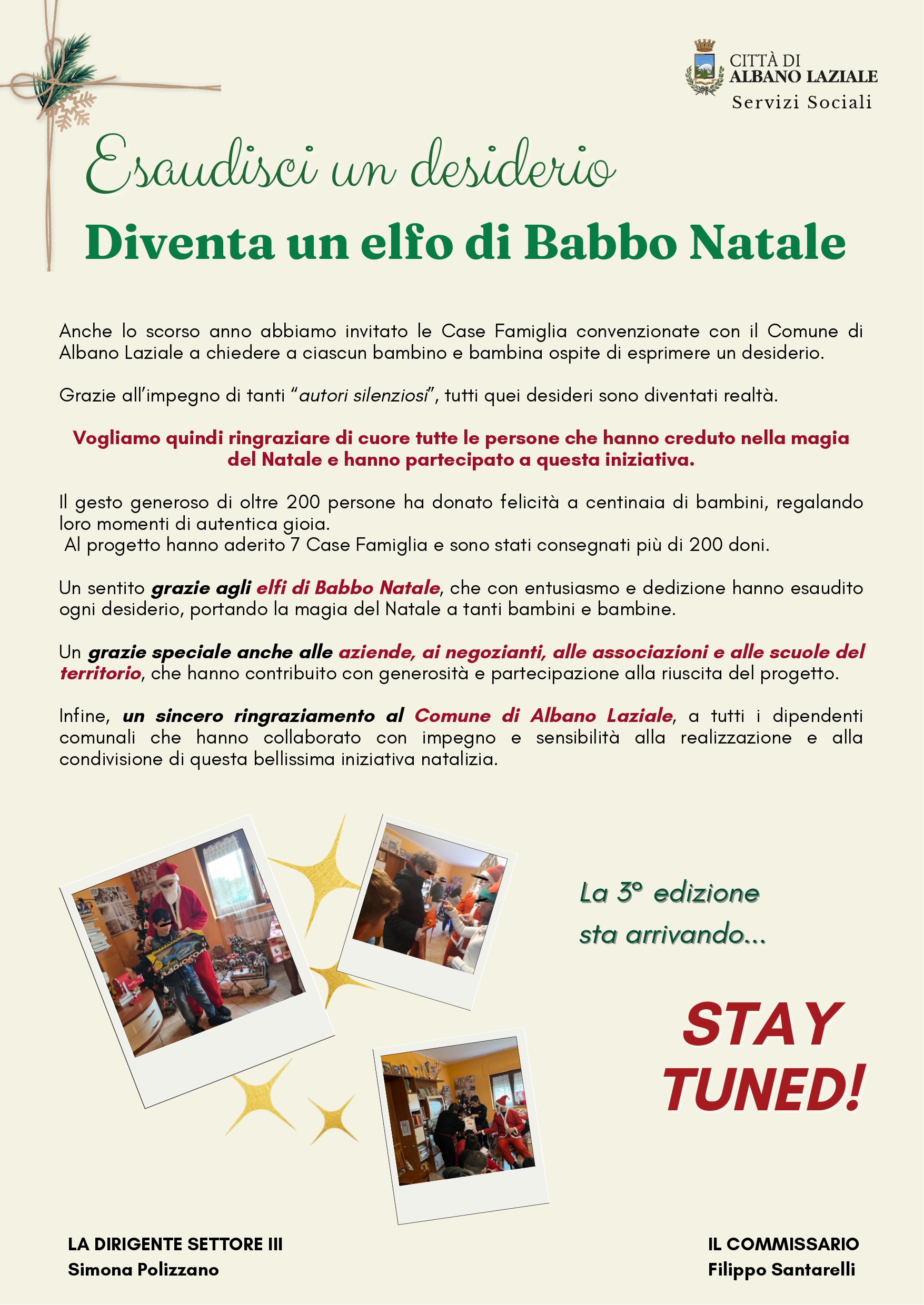 L'Amministrazione Comunale desidera esprimere un sincero e profondo ringraziamento a tutte le persone che, con cuore e generosità, hanno partecipato all’iniziativa “Esaudisci un desiderio – Diventa un elfo di Babbo Natale”.