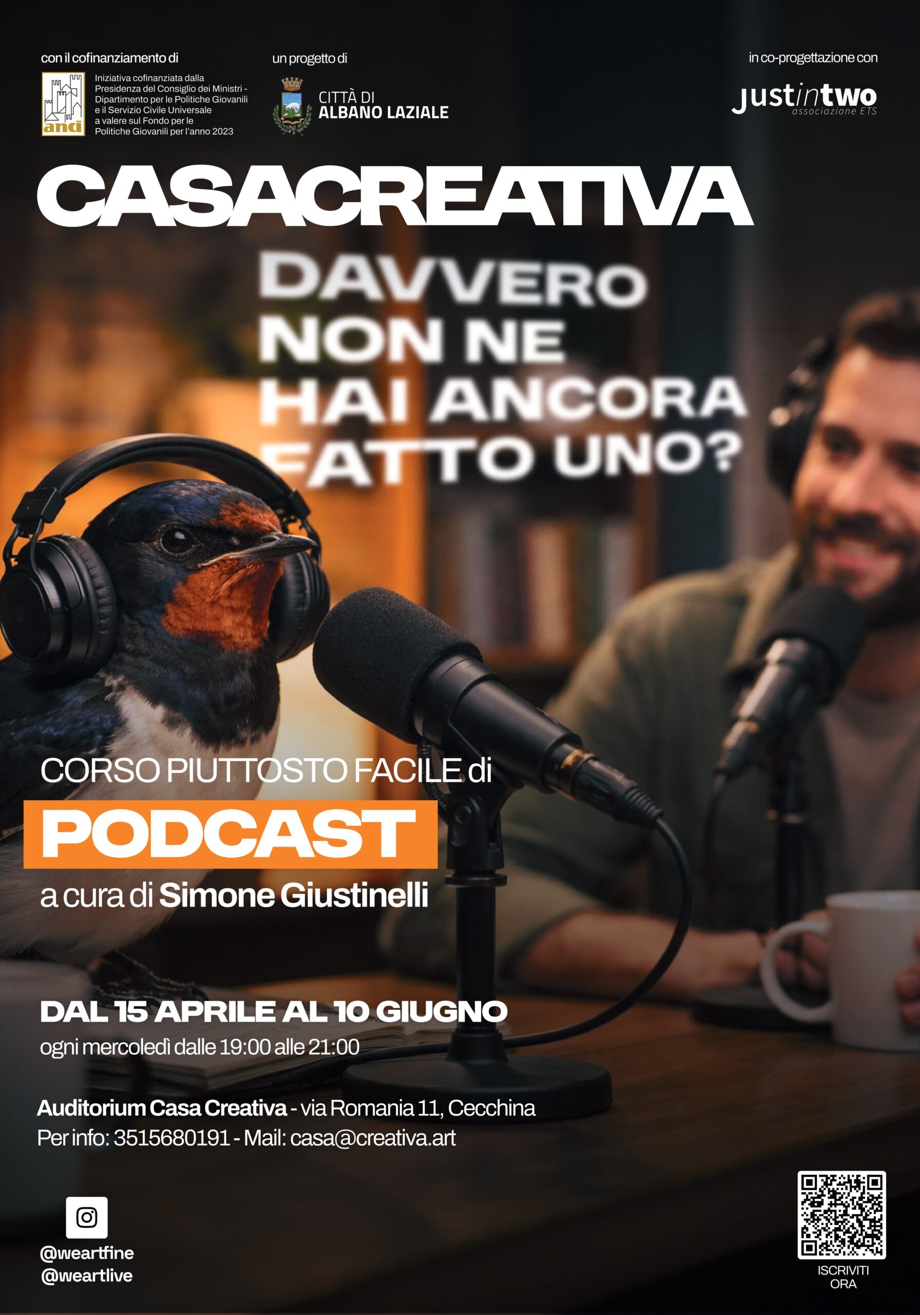 Dal 15 aprile al 10 giugno 2026, ogni mercoledì dalle ore 19.00, in Casa Creativa a Cecchina si terrà il Corso Piuttosto Facile di Podcast, un nuovo laboratorio promosso dalla Città di Albano Laziale in collaborazione con Justintwo ETS.