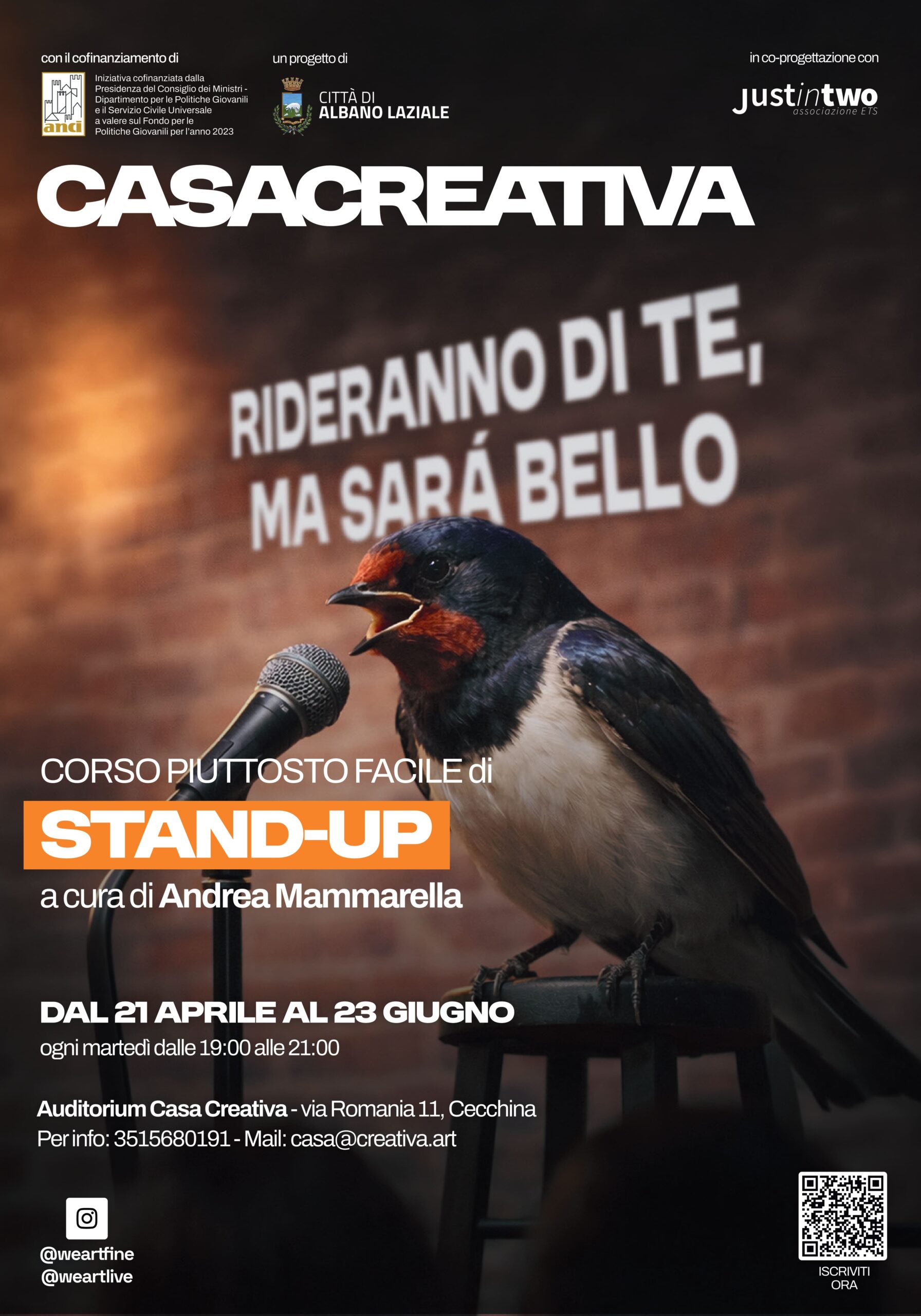 Corso gratuito di stand up comedy a Cecchina in Casa Creativa, con lezioni dal 21 aprile al 23 giugno 2026, ogni martedì dalle ore 19.00 alle ore 21.00. Per partecipare è necessaria la prenotazione.
