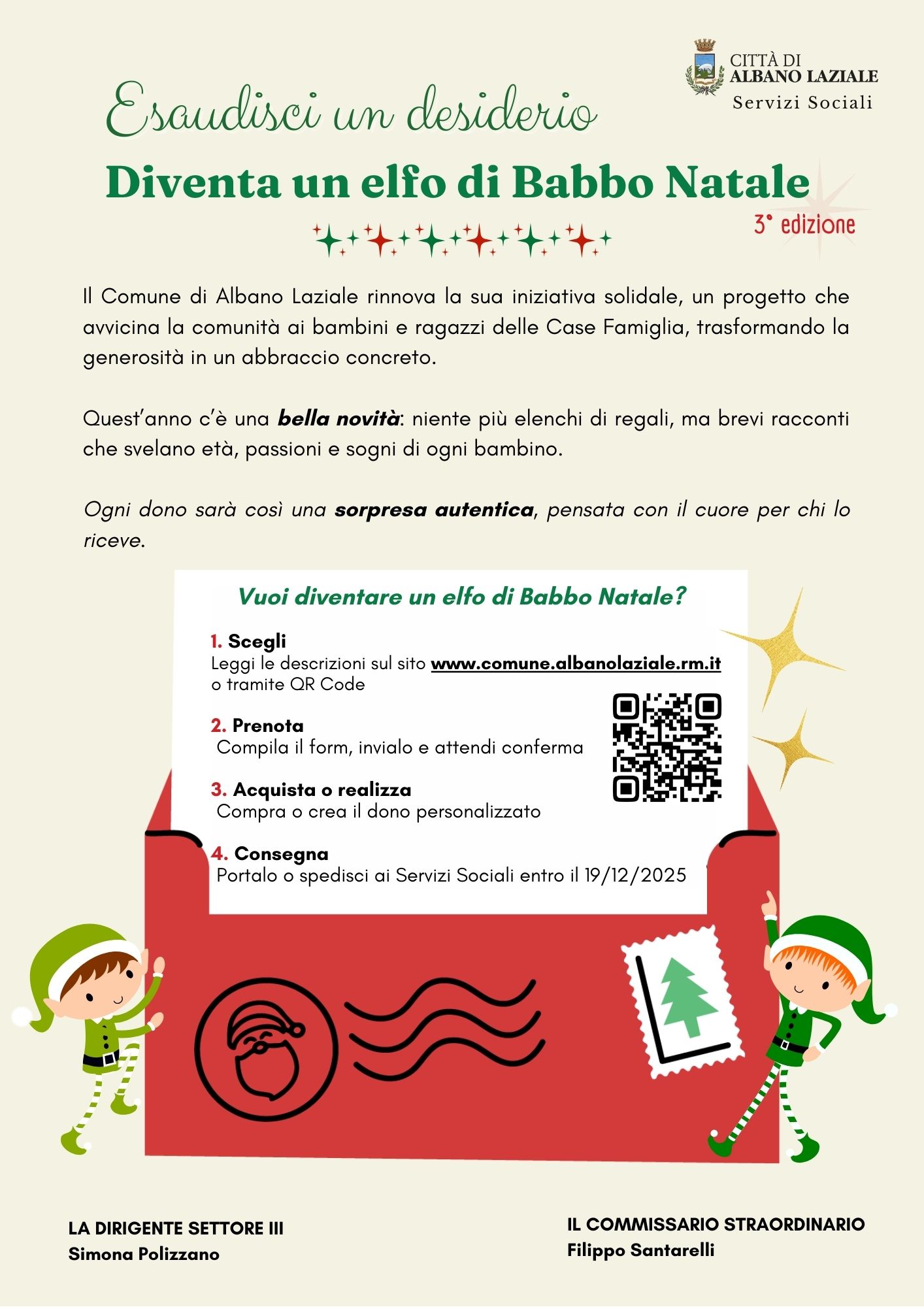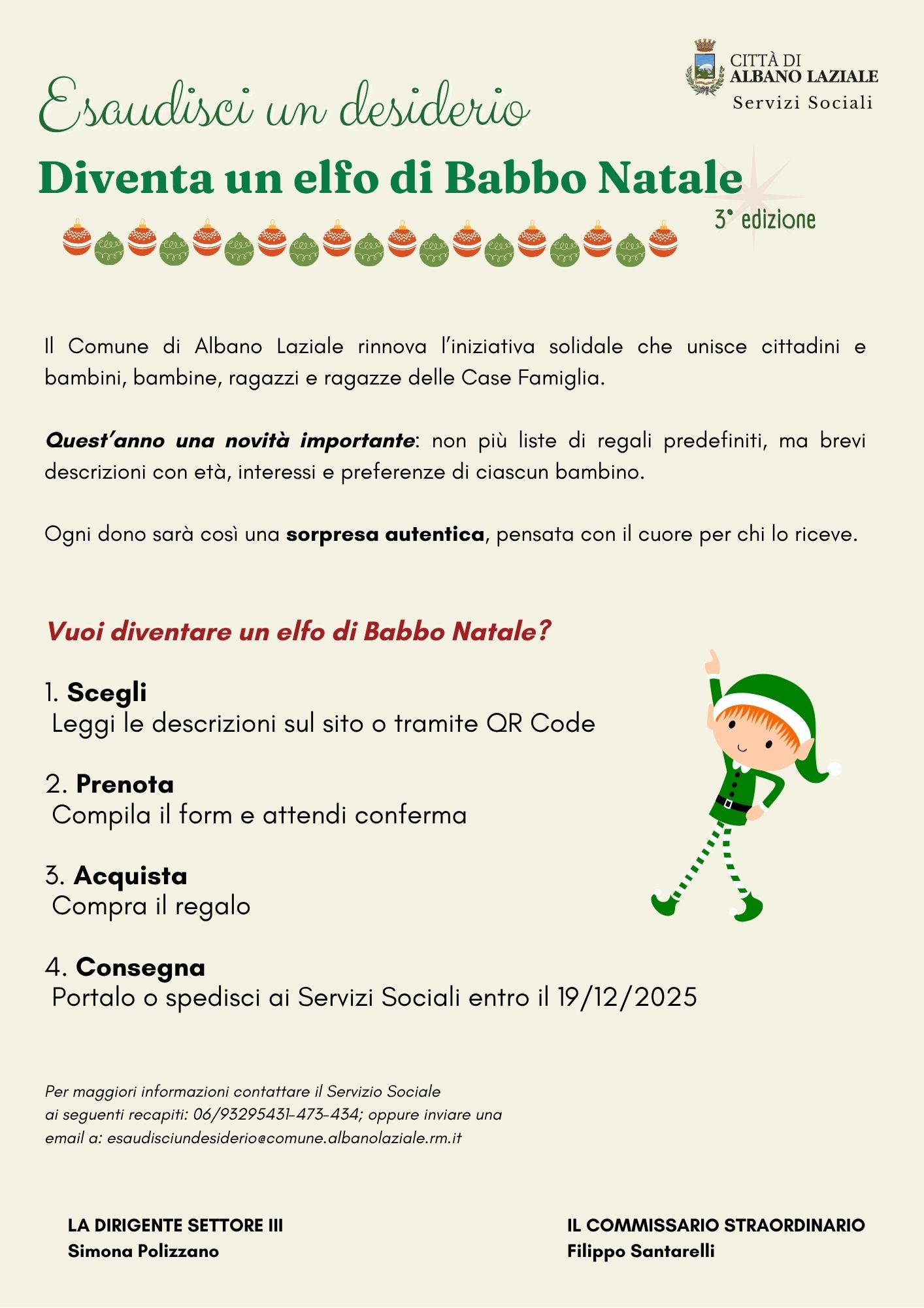 Per maggiori informazioni contattare il Servizio Sociale ai seguenti recapiti: 06/93295431-473, oppure inviare una email a: esaudisciundesiderio@comune.albanolaziale.rm.it