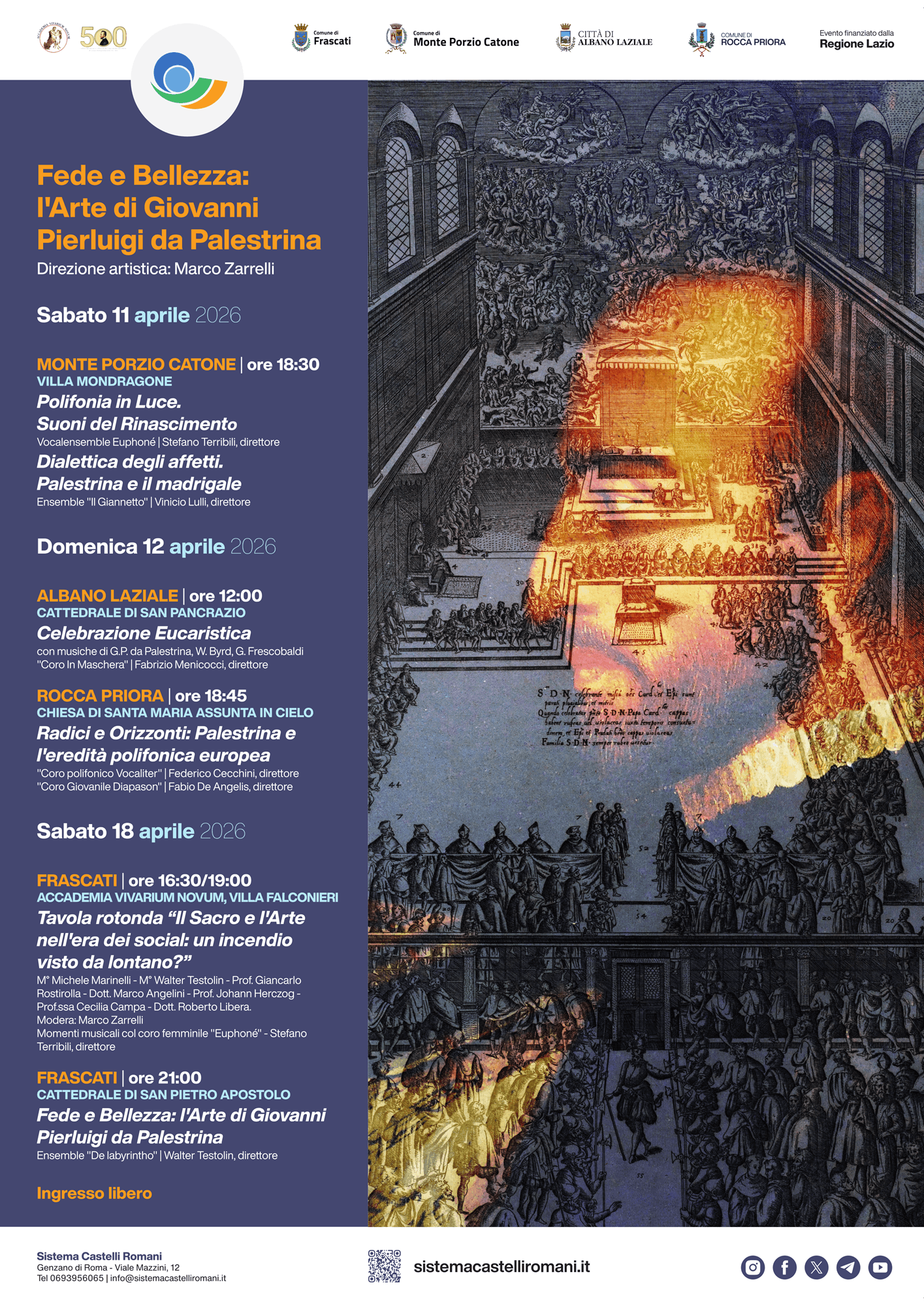 Dal 11 aprile al 18 aprile 2026 i Castelli Romani ospiteranno la rassegna “Fede e Bellezza: l’Arte di Giovanni Pierluigi da Palestrina”, iniziativa culturale dedicata al grande maestro della polifonia rinascimentale.