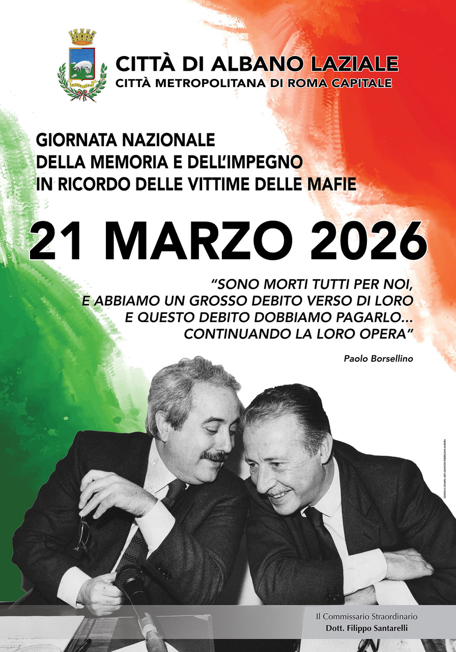 In occasione del 21 marzo 2026, Giornata Nazionale della Memoria e dell’Impegno in ricordo delle vittime delle mafie, la Città di Albano Laziale si unisce al ricordo di tutte le donne e gli uomini che hanno sacrificato la propria vita nella lotta contro la criminalità organizzata.