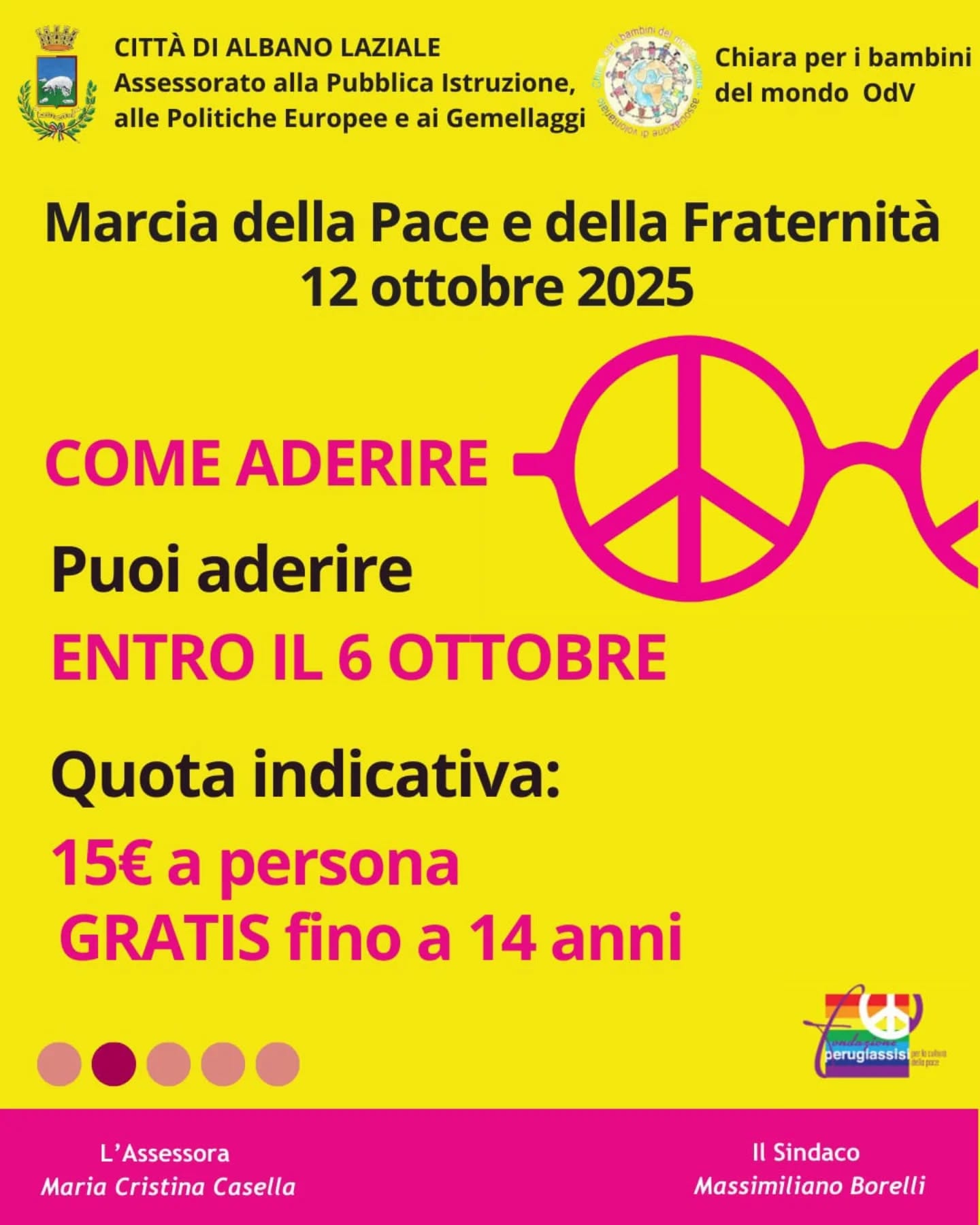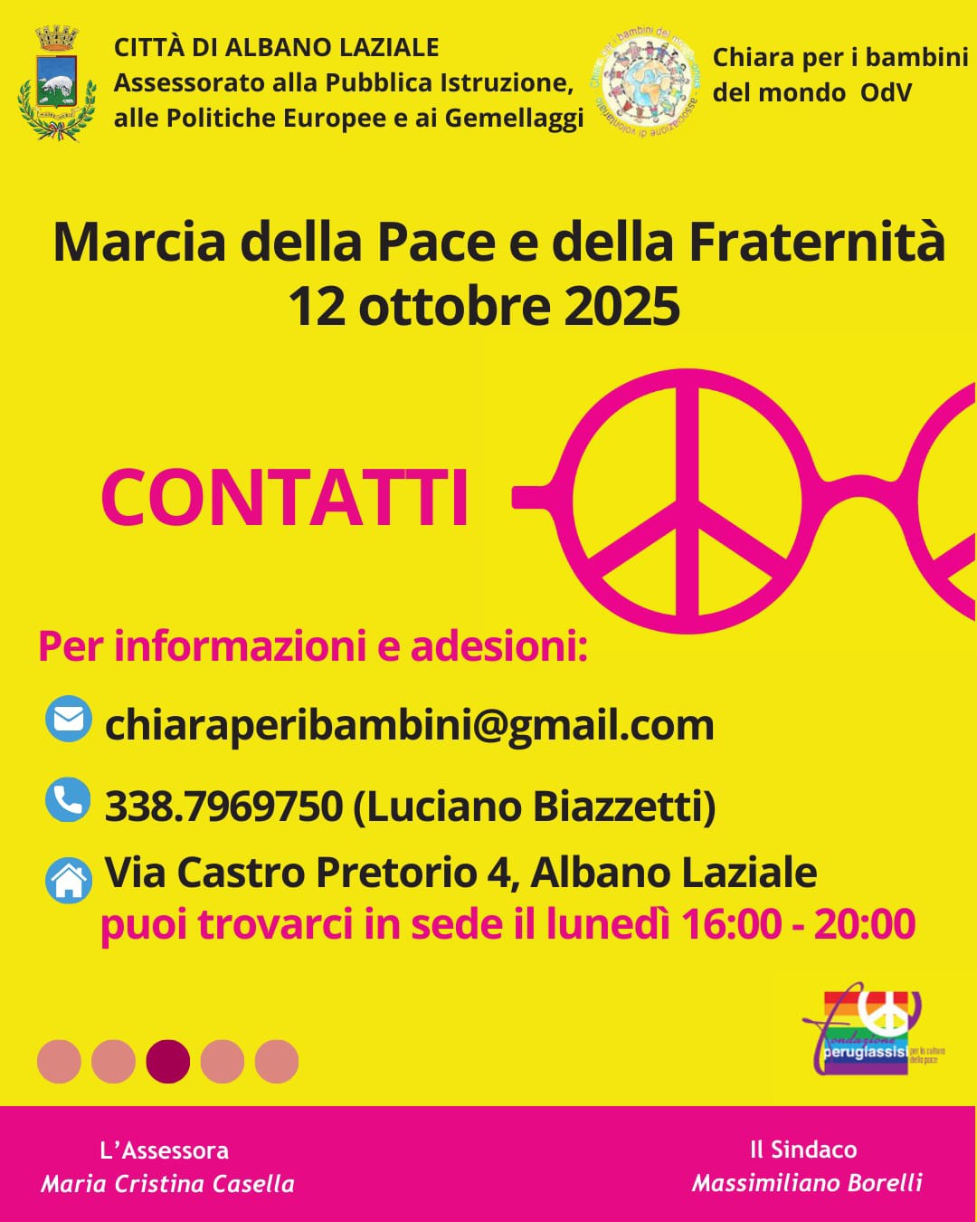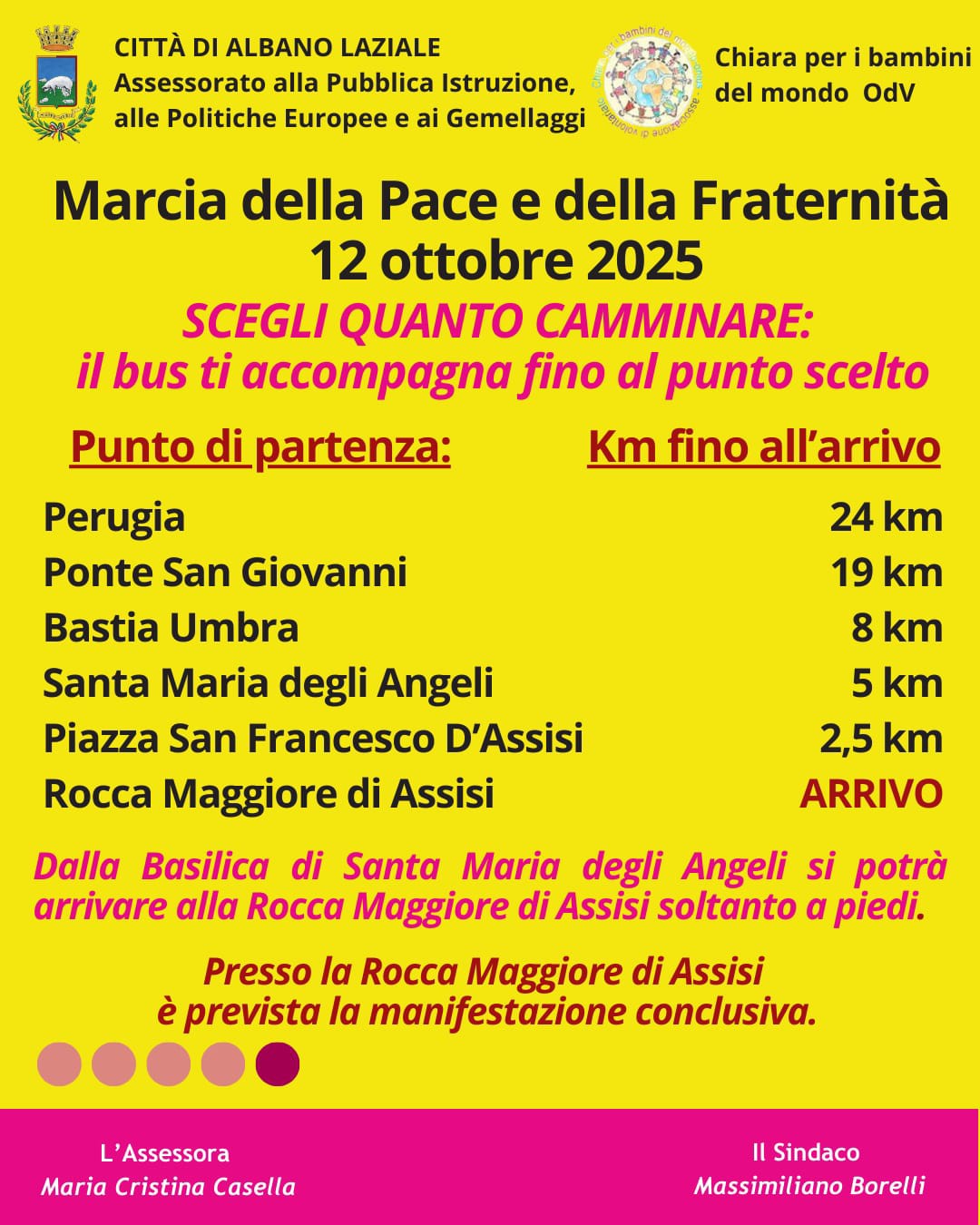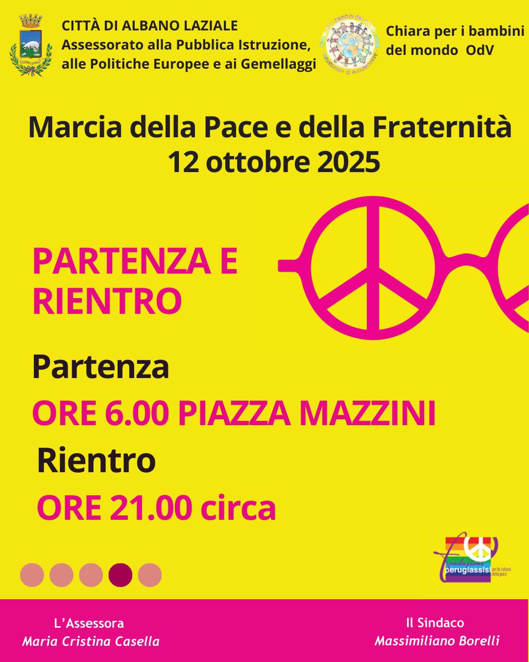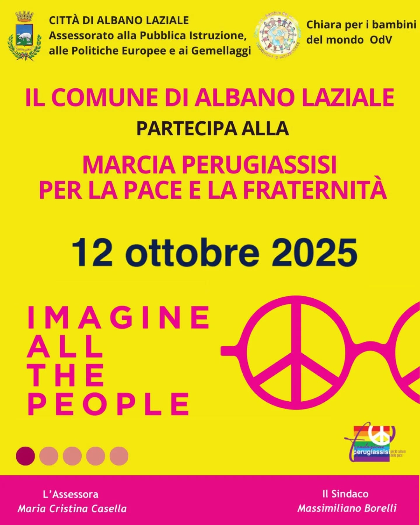La Città di Albano Laziale aderisce alla 𝑴𝒂𝒓𝒄𝒊𝒂 𝒅𝒆𝒍𝒍𝒂 𝑷𝒂𝒄𝒆 𝒆 𝒅𝒆𝒍𝒍𝒂 𝑭𝒓𝒂𝒕𝒆𝒓𝒏𝒊𝒕𝒂̀ 𝑷𝒆𝒓𝒖𝒈𝒊𝒂 – 𝑨𝒔𝒔𝒊𝒔𝒊