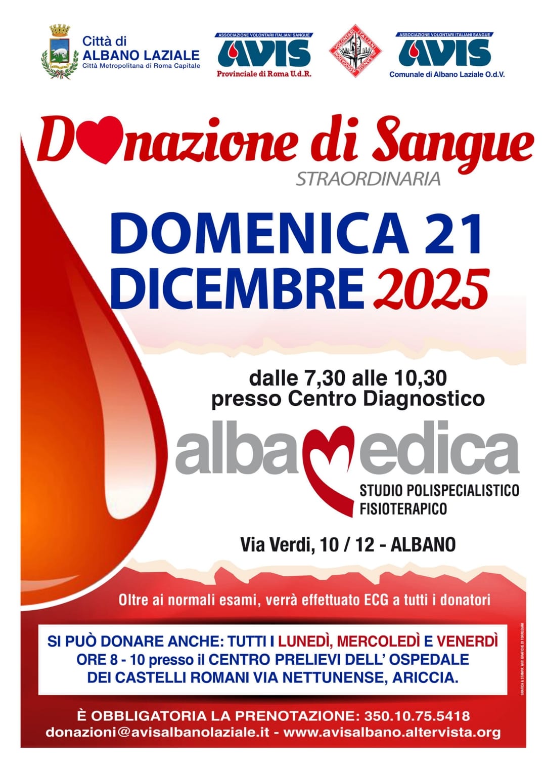 L’AVIS di Albano Laziale organizza una giornata di raccolta sangue domenica 21 dicembre 2025, dalle ore 7:30 alle 10:30, presso il Centro Diagnostico Albamedica, situato in via Verdi 10/12, Albano Laziale.