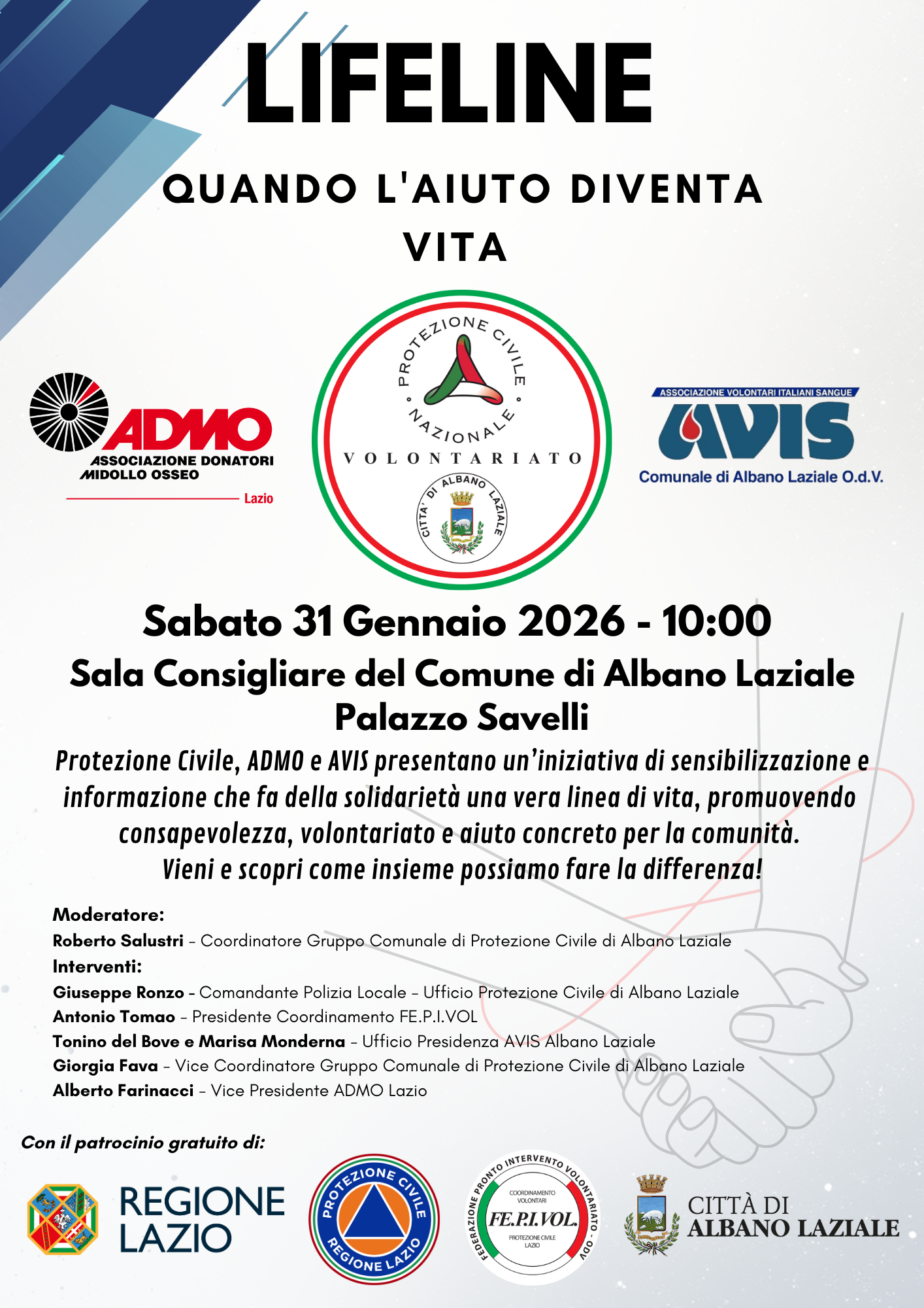 Sabato 31 gennaio alle 10:00, Palazzo Savelli ospita il lancio di "LIFELINE". Protezione Civile, AVIS e ADMO uniscono le forze per promuovere la cultura del dono, la prevenzione e la solidarietà ad Albano Laziale.