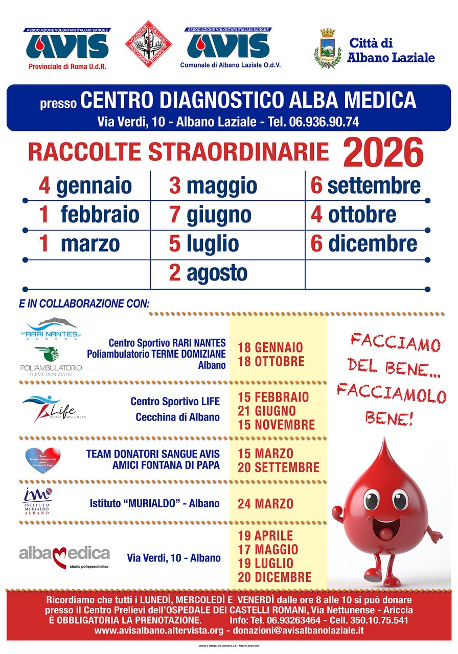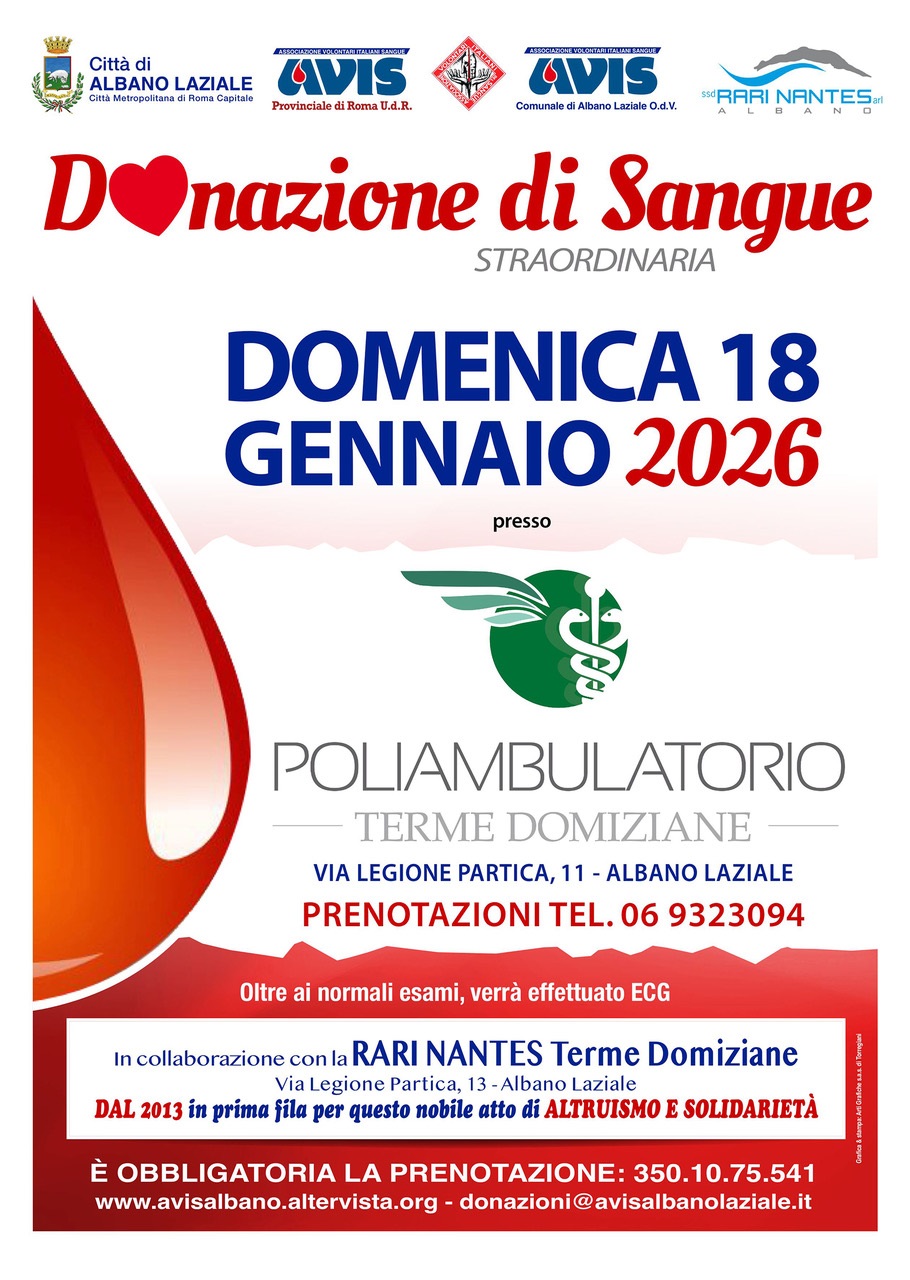 Domenica 18 gennaio 2026, raccolta straordinaria organizzata dall'AVIS Comune di Albano Laziale in collaborazione con il Centro Sportivo Rari Nantes presso il Poliambulatorio Terme Domiziane in Albano Laziale, sito in Via della Legione Partica, n. 11.