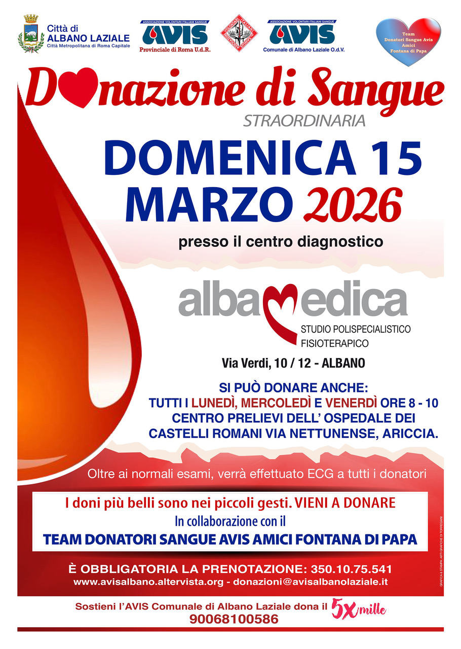 Domenica 15 marzo 2026, dalle ore 07.30 alle ore 10.30, raccolta straordinaria organizzata dall'AVIS Comune di Albano Laziale in collaborazione con il Team Donatori Sangue AVIS Amici di Fontana di Papa.