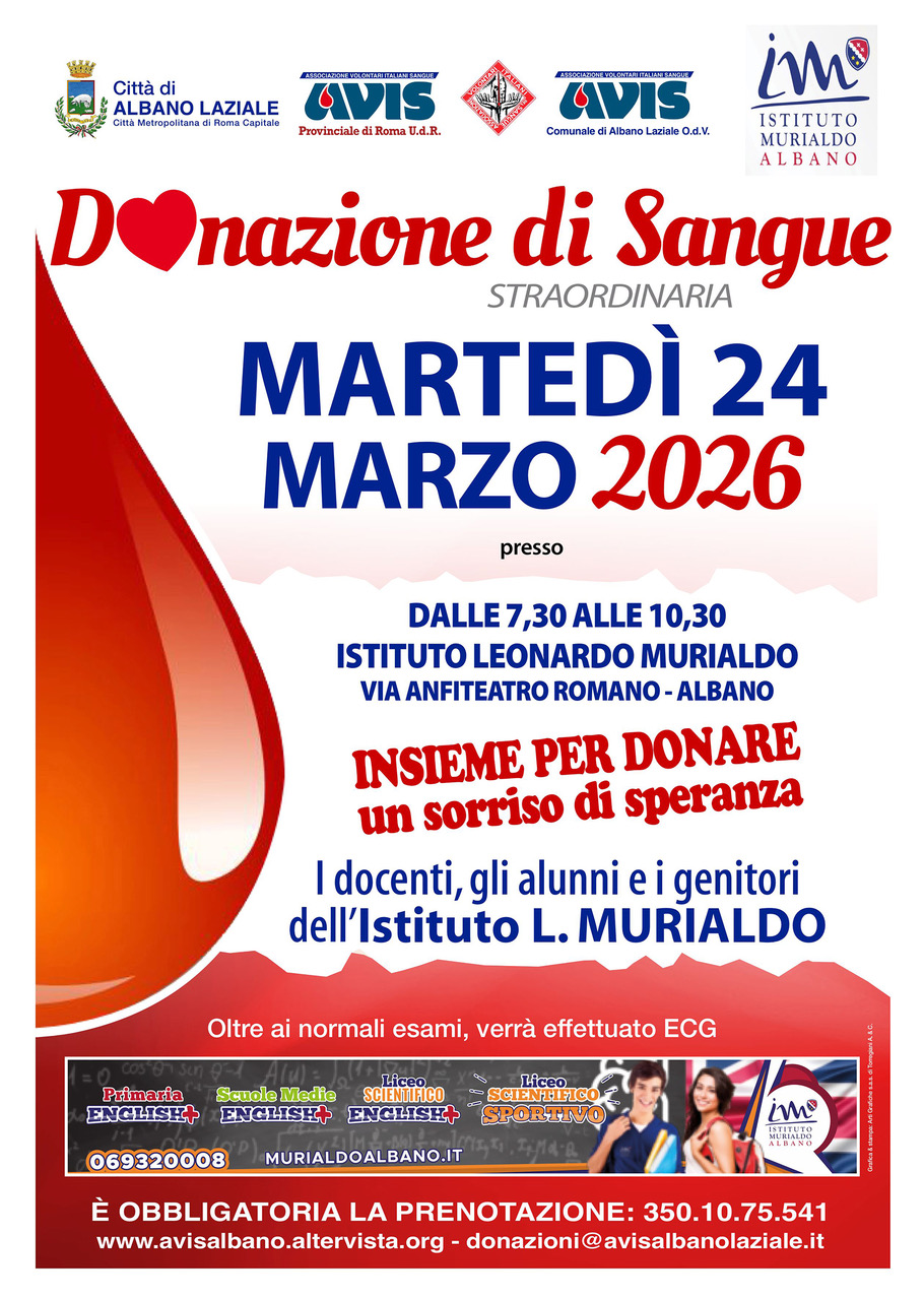 Martedì 24 marzo 2026, dalle ore 07.30 alle ore 10.30, raccolta straordinaria organizzata dall'AVIS Comune di Albano Laziale in collaborazione con docenti, genitori e alunni dell'Istituto Murialdo.