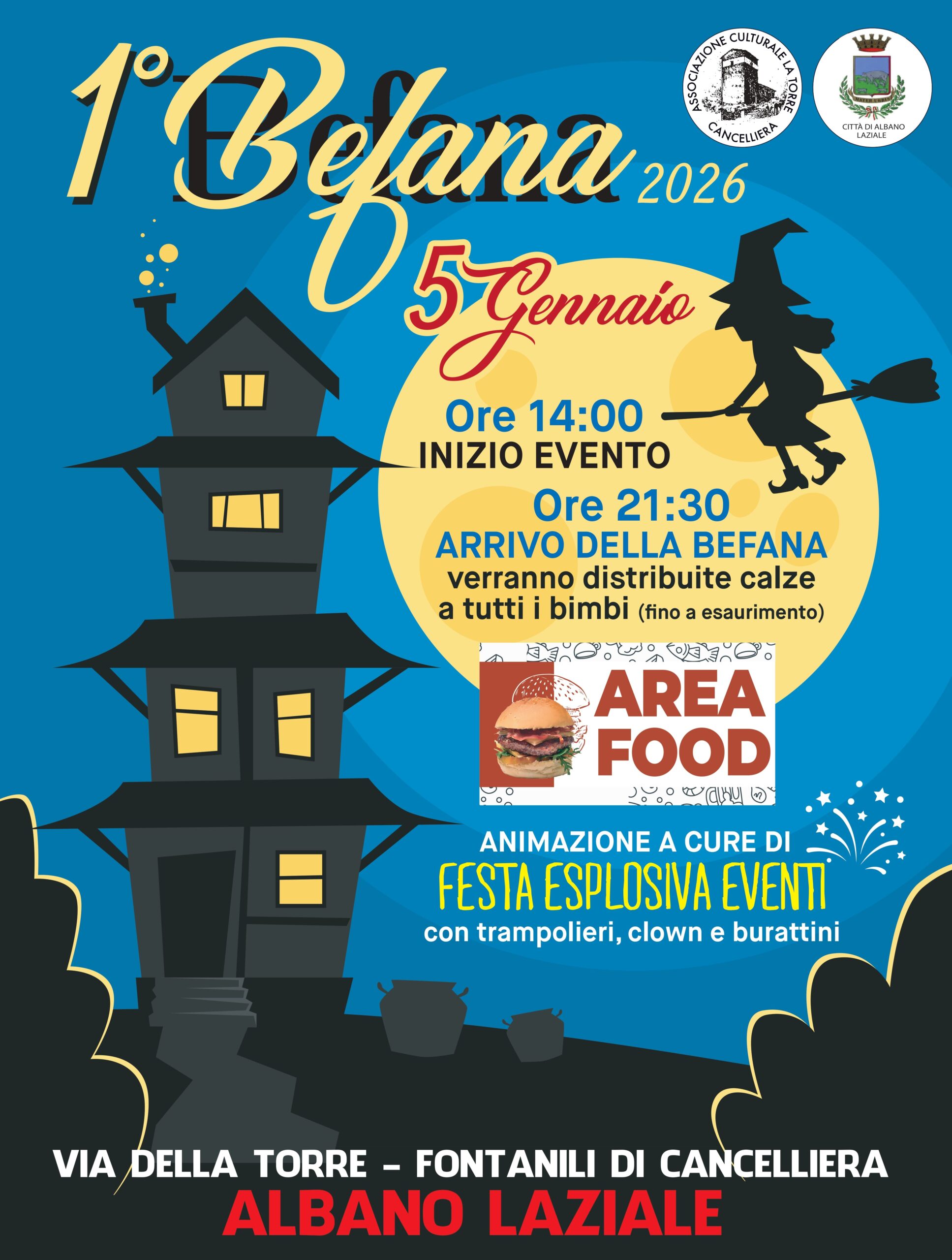 Dalle ore 14.00, in Via della Torre -Fontanile di Cancelliera, pomeriggio di festa con trampolieri, clown e burattini e alle ore 21.30 magica sorpresa per i bambini, con l'arrivo della Befana e la distribuzione delle calze.