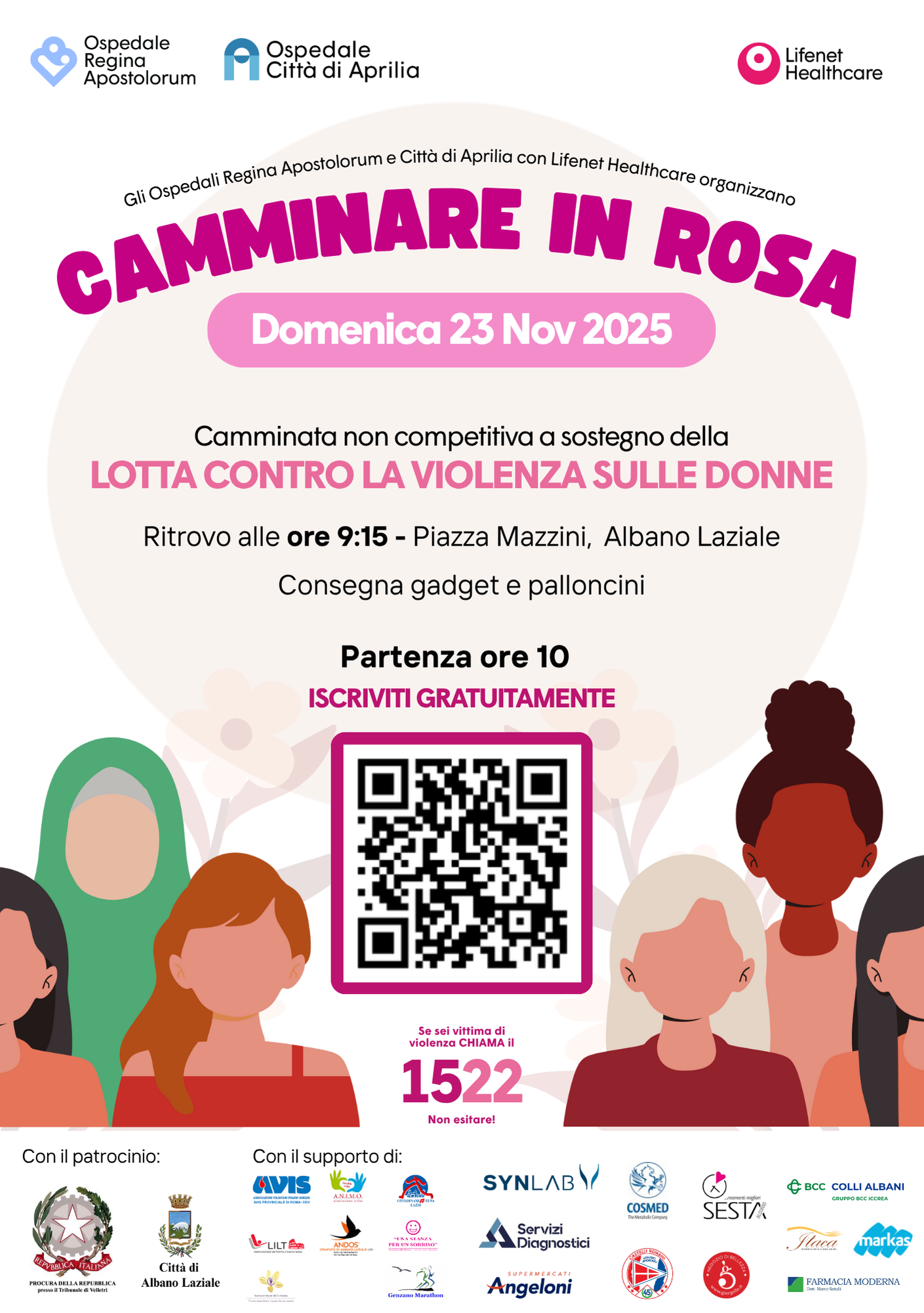 Gli Ospedali Regina Apostolorum e Città di Aprilia e con il supporto di Lifenet Healthcare, promuovono la Camminata in Rosa, evento non competitivo a sostegno della lotta contro la violenza sulle donne. L’iniziativa è patrocinata dalla Procura della Repubblica del Tribunale di Velletri e si inserisce nelle attività promosse in occasione della Giornata internazionale per l’eliminazione della violenza contro le donne.