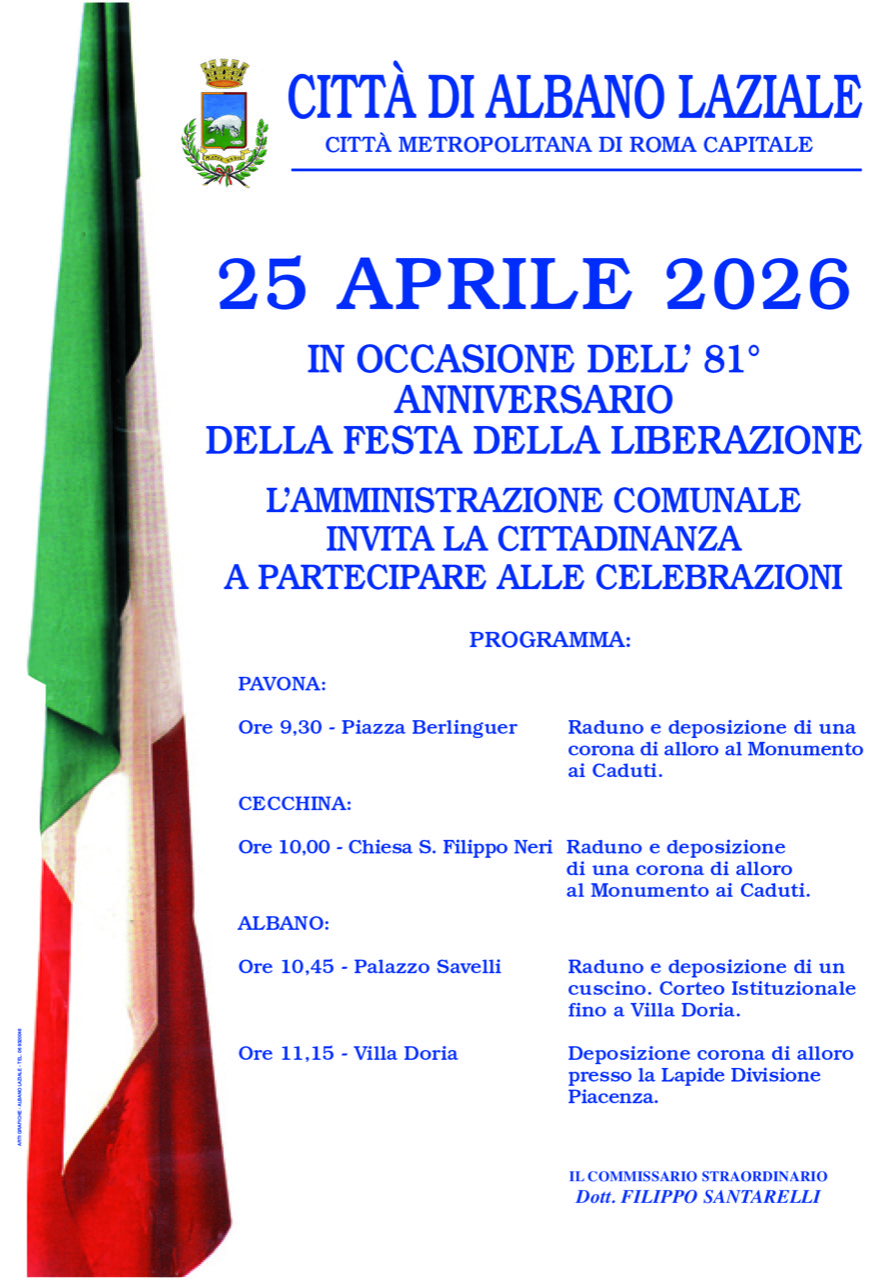 Il 25 aprile 2026 l’Amministrazione Comunale invita la cittadinanza a partecipare alle celebrazioni per l’81° Anniversario della Festa della Liberazione. Le commemorazioni si svolgeranno su tutto il territorio comunale, con momenti di raccoglimento e deposizioni floreali presso i monumenti cittadini. Il programma della giornata prevede: