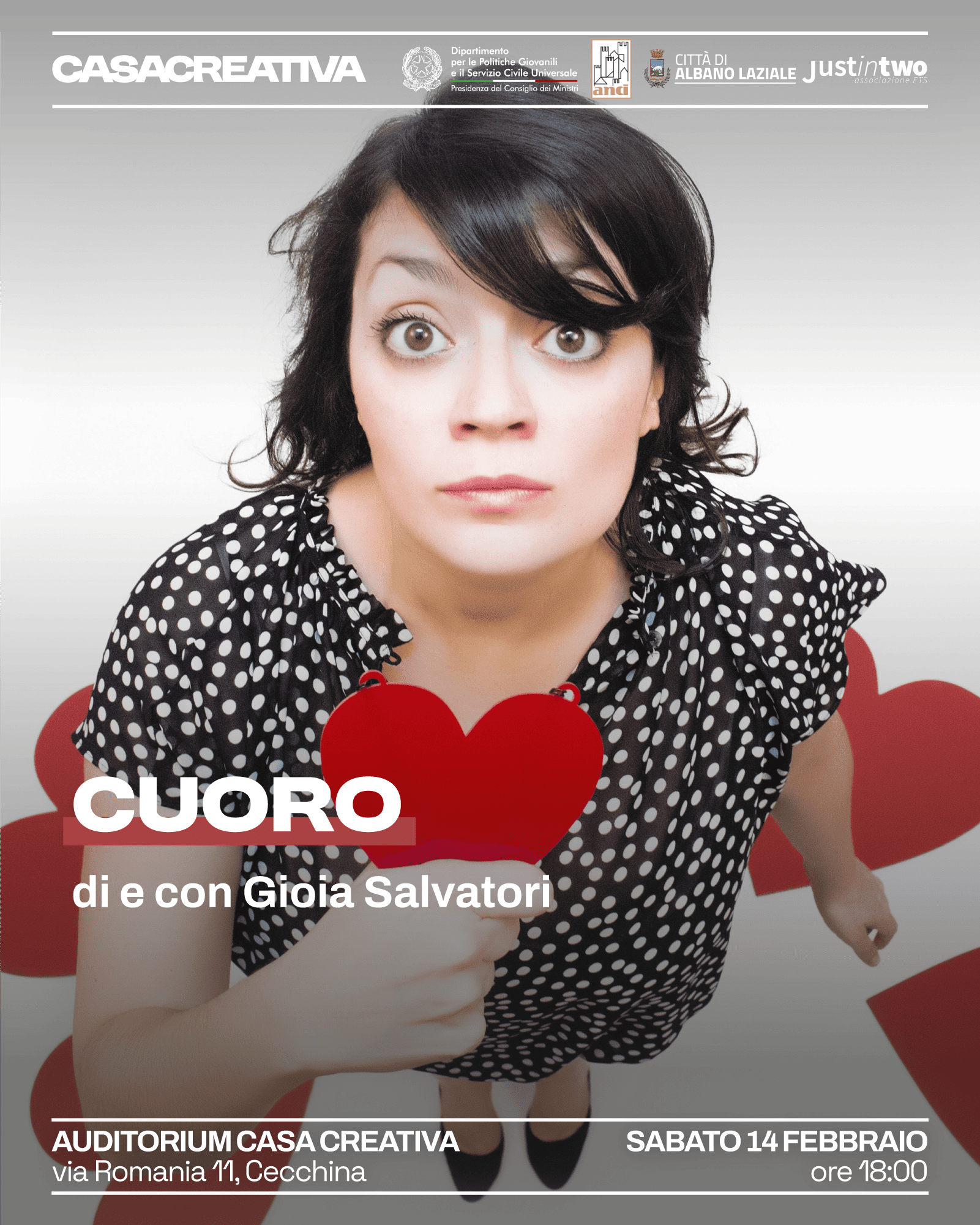 Sabato 14 febbraio, alle ore 18:00, Casa Creativa ospita "Cuoro", monologo scritto e interpretato da Gioia Salvatori, che affronta il tema dell’amore contemporaneo con uno sguardo ironico, poetico e profondamente umano.
