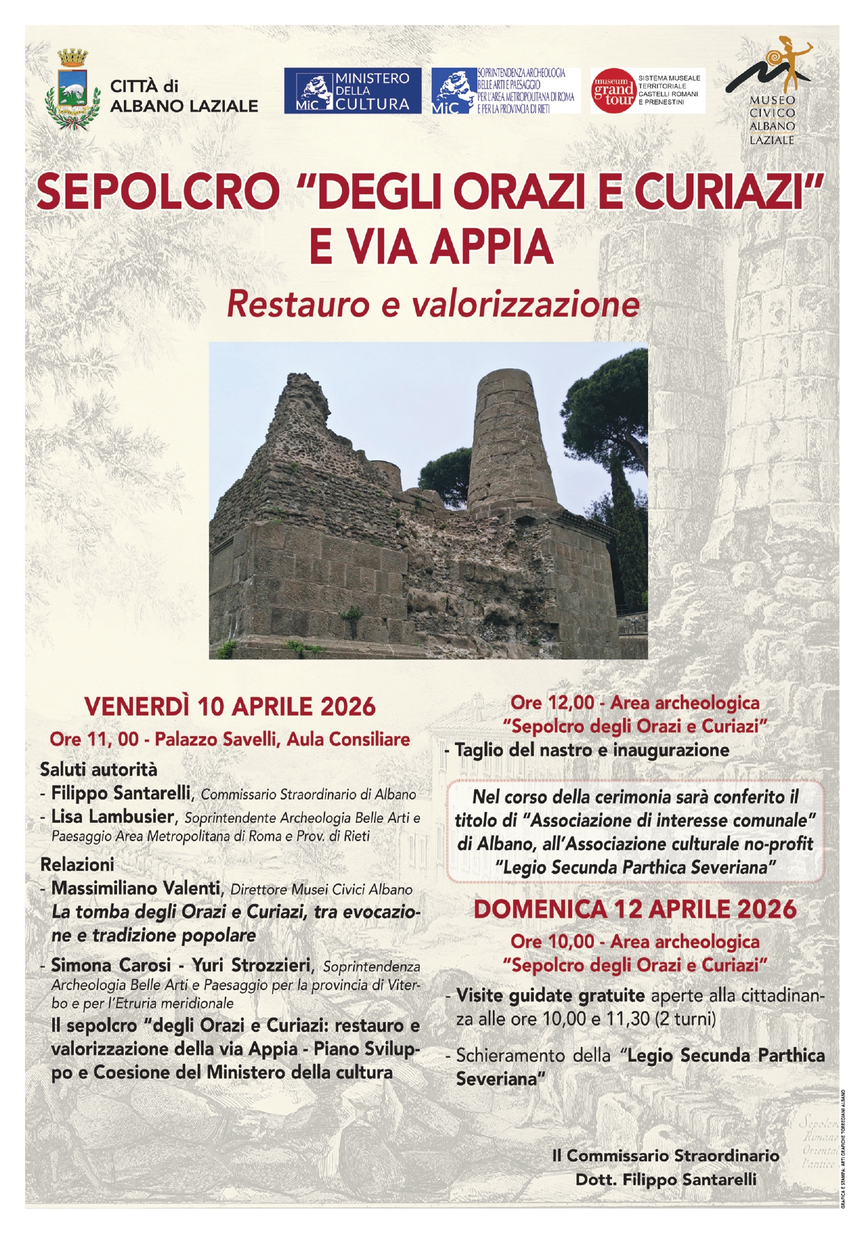 Venerdì 10 aprile 2026, alle ore 11:00, presso l’aula consiliare di Palazzo Savelli, si terrà la cerimonia di presentazione del restauro del Sepolcro degli Orazi e Curiazi e della valorizzazione della via Appia, promossa nell’ambito del Piano di Sviluppo e Coesione del Ministero della Cultura.
