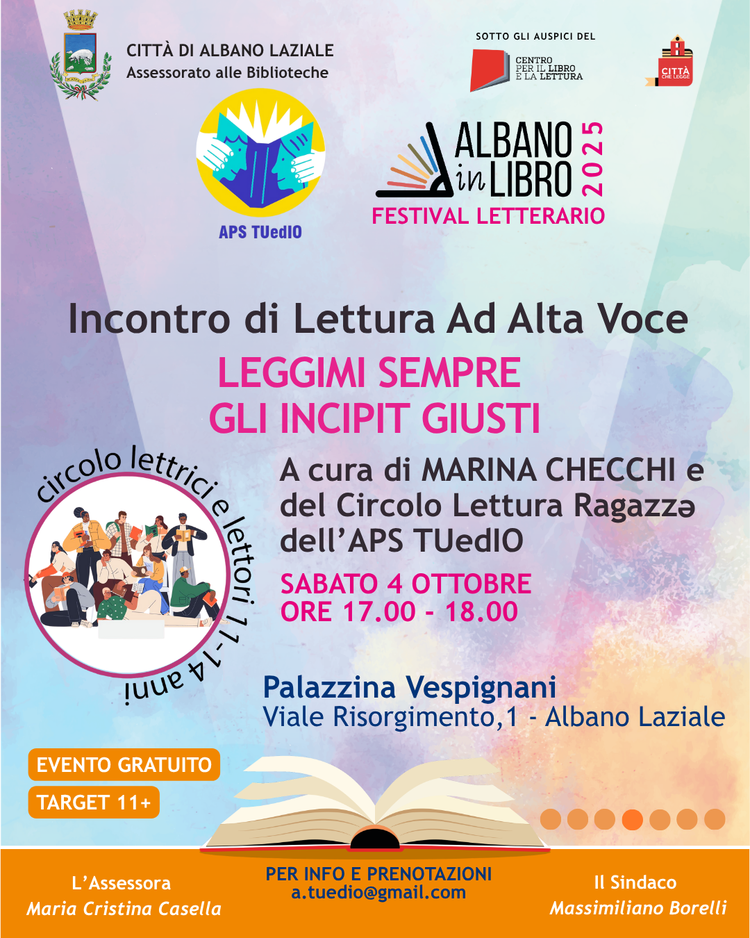 In occasione del Festival Letterario Albano In Libro 2025, la Palazzina Vespignani ospita un coinvolgente Incontro di Lettura Ad Alta Voce intitolato “LEGGIMI SEMPRE… GLI INCIPIT GIUSTI”.