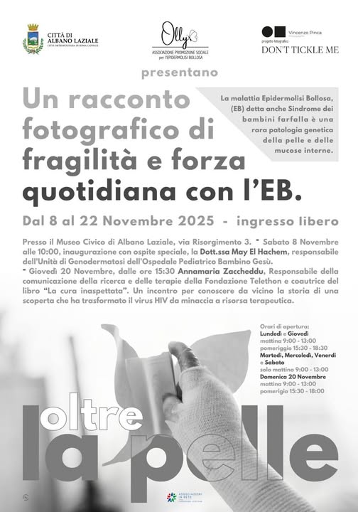 In occasione della Settimana di Sensibilizzazione sull’Epidermolisi Bollosa, il Museo Mario Antonacci ospita la mostra fotografica “Oltre La Pelle”, a cura di Olly APS in collaborazione con il fotografo Vincenzo Pinca. La mostra nasce dal progetto universitario Don’t Tickle Me e racconta la vita quotidiana di Olivia, una bambina di cinque anni affetta da epidermolisi bollosa, restituendo un ritratto autentico di forza, amore e normalità.