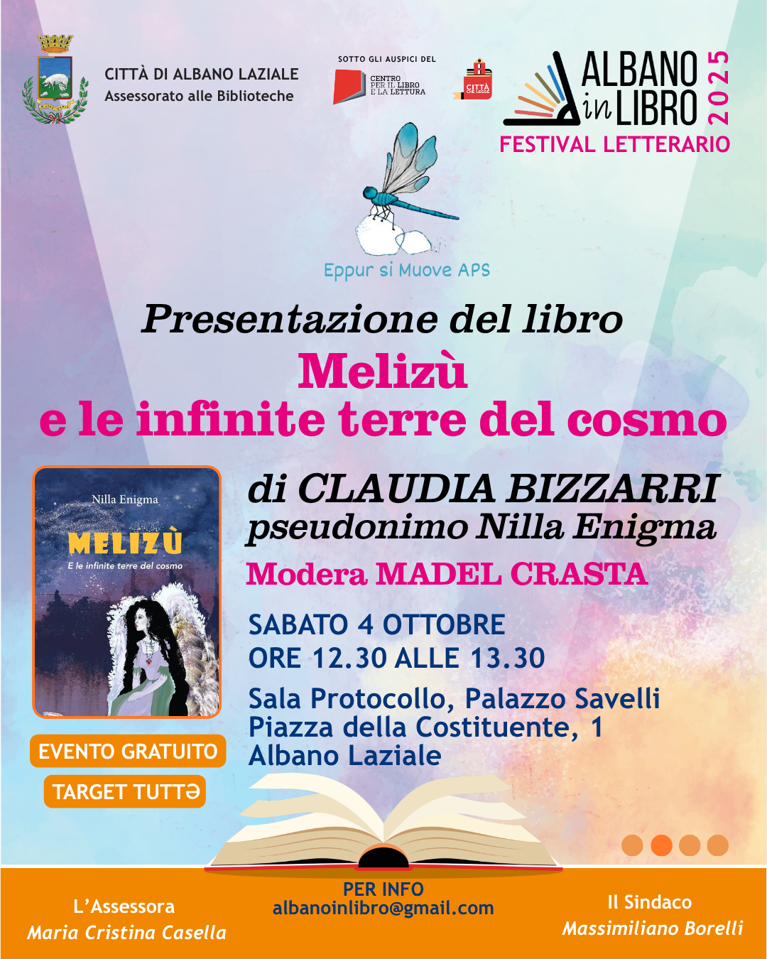 In occasione del Festival Letterario Albano In Libro 2025, la Sala Protocollo di Palazzo Savelli ospita la presentazione del coinvolgente romanzo fantasy “Melizù e le infinite terre del cosmo”, edito da InchiostroVivo, a cura di Eppur si Muove APS.
