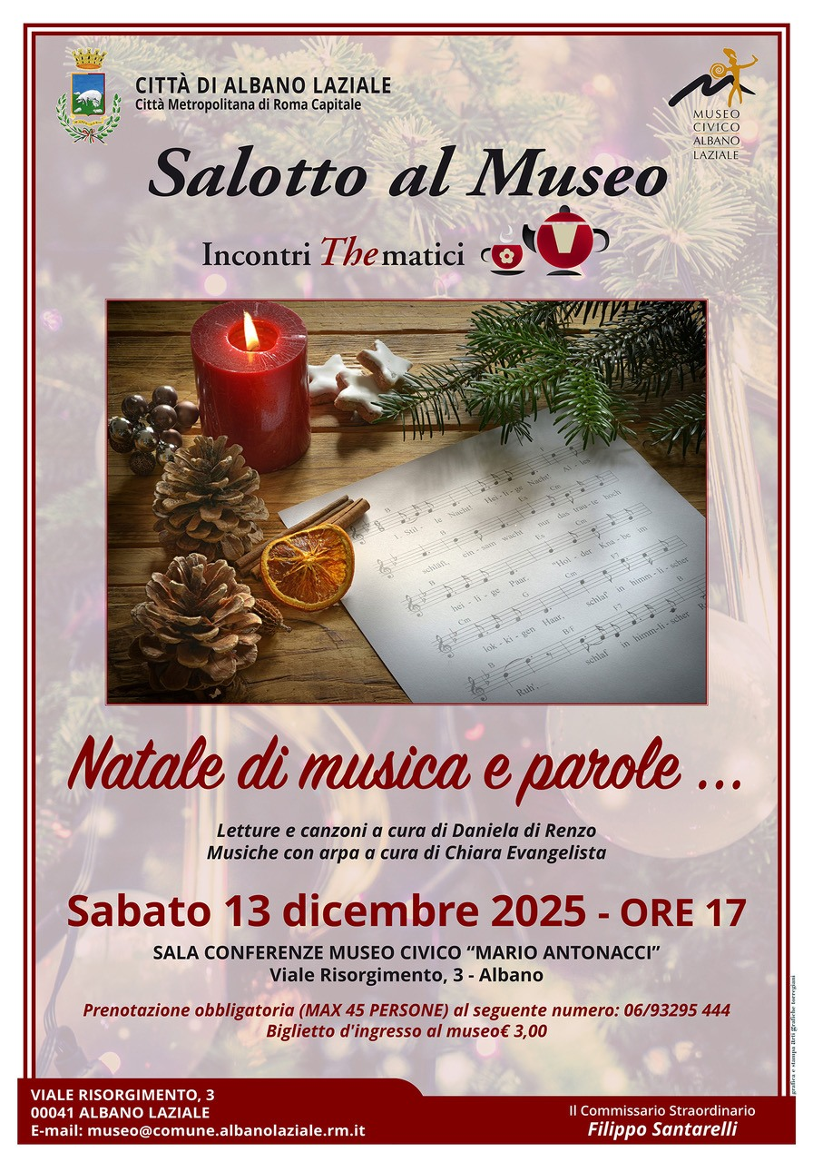 Torna anche quest'anno Il Salotto al Museo: letture sul Natale e improvvisazioni vocali su musica di arpa, con degustazione di thè e biscotti.