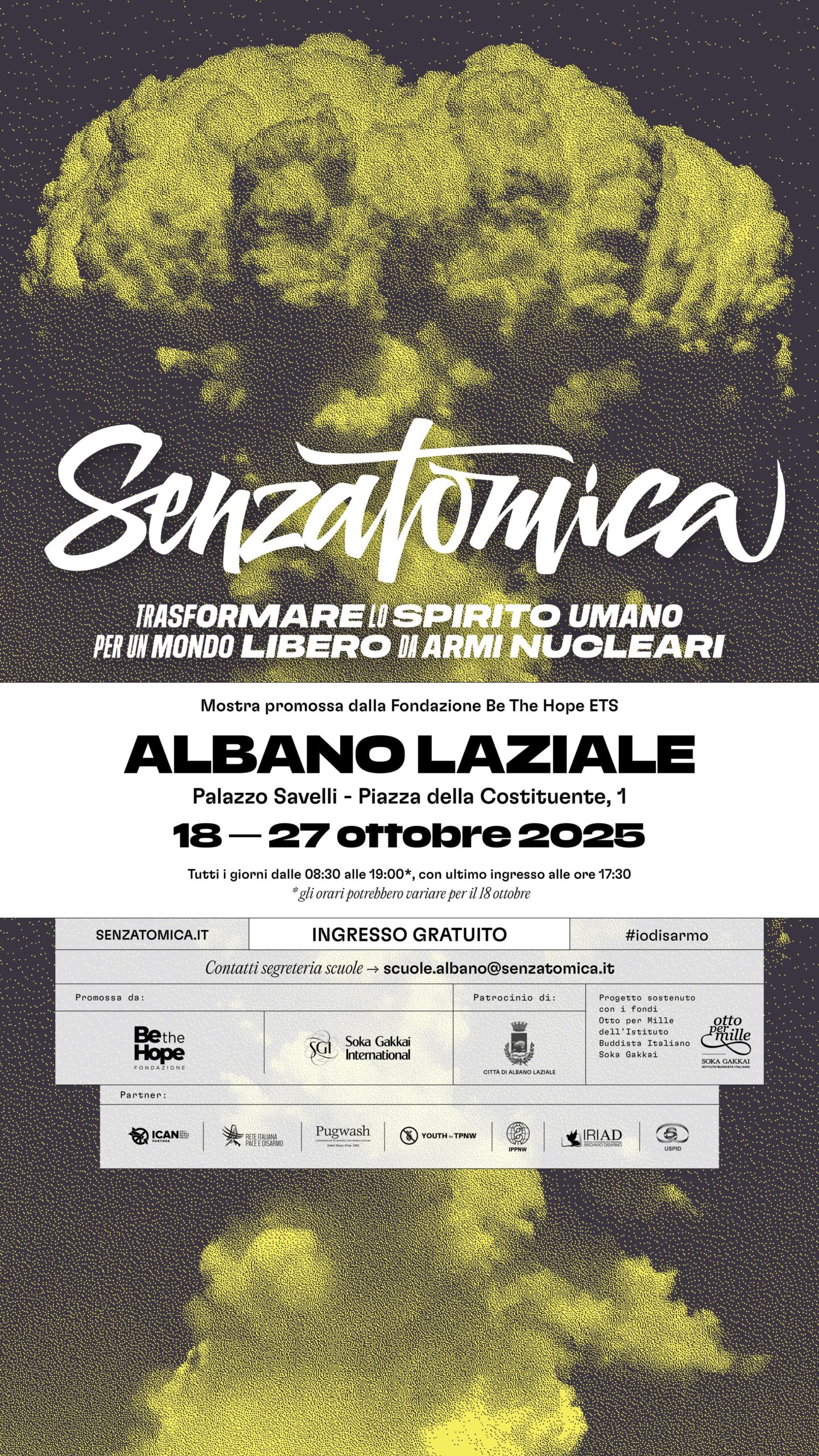 La mostra “Senzatomica. Trasformare lo spirito umano per un mondo libero da armi nucleari” arriva ad Albano Laziale, presso Palazzo Savelli Piazza Della Costituente, 1 - dal 18 al 27 ottobre 2025 (orari: tutti i giorni dalle 08:30 alle 19:00, con ultimo ingresso alle ore 17:30). L’esposizione, in versione compact verrà inaugurata il 18 ottobre 2025 alle ore 17:00.