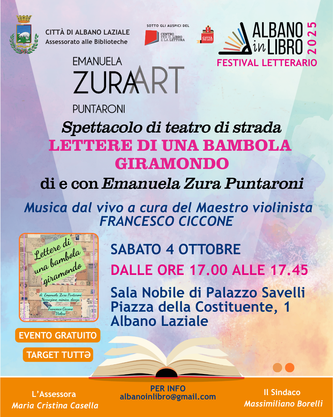 In occasione del Festival Letterario Albano In Libro 2025, la Sala Nobile di Palazzo Savelli si trasforma in un palcoscenico per lo spettacolo di teatro di strada “Lettere di una bambola giramondo”.